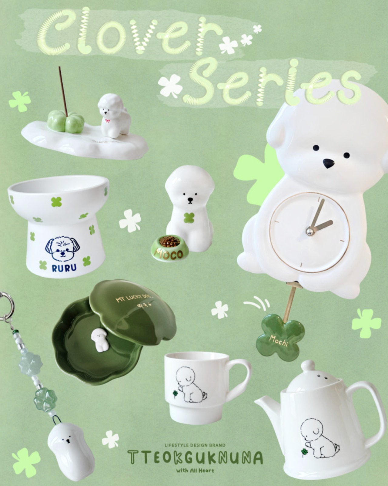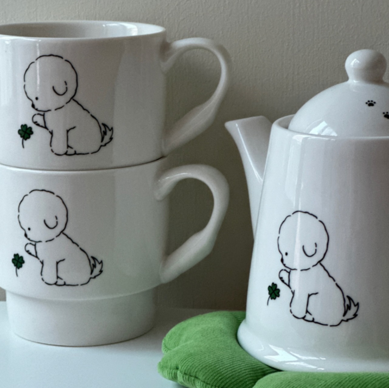 [予約販売] [tteokguk_nuna] Clover Mugは、洗練されたクローバーと可愛いわんちゃんのデザインが特徴の美しいマグカップです!美しい陶器の質感を生かし、日常使いにも特別なティータイムにもぴったり。大切な方への贈り物にも最適で、オシャレなグリーンが食卓を明るく彩ります。どんなシーンでも使いやすく、心をほっこりとさせる一品です!