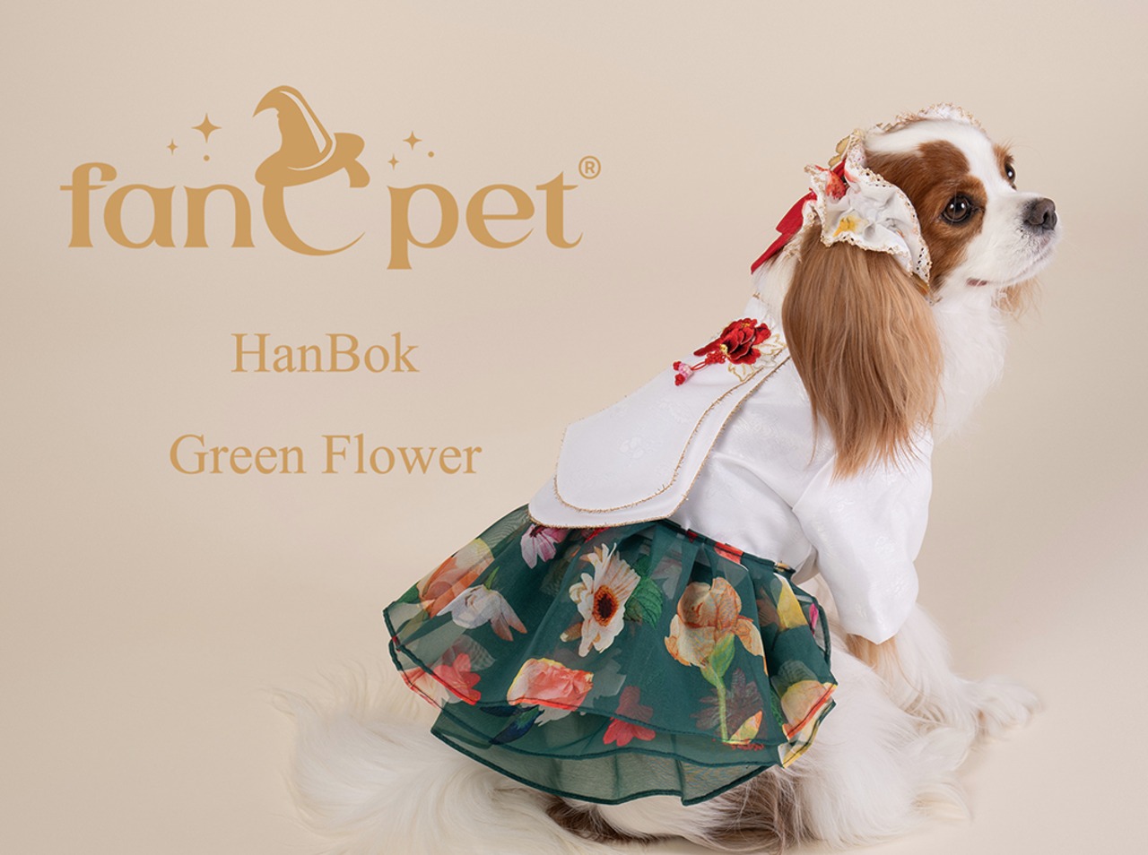 [予約販売] [fanCpet]Green Flower HanBok (Dress) Girlは、女の子の可愛らしさを引き出す華やかなデザインの伝統的な韓服スタイルです!特別な日や大切なイベントに最適な一着で、愛犬愛猫をおしゃれに演出します。柔らかな素材を使用しており、快適な着心地を実現。美しい緑の花の模様が特徴で、様々なシーンでのコーディネートにも映えるアイテムです。愛犬愛猫との思い出をより特別にするためにぜひ取り入れてください!