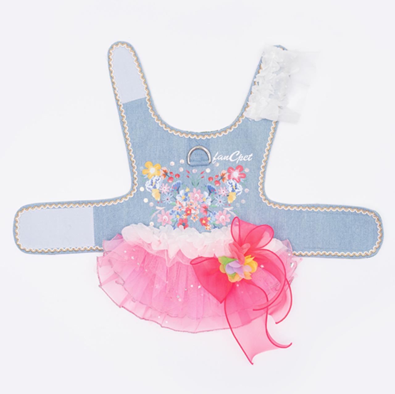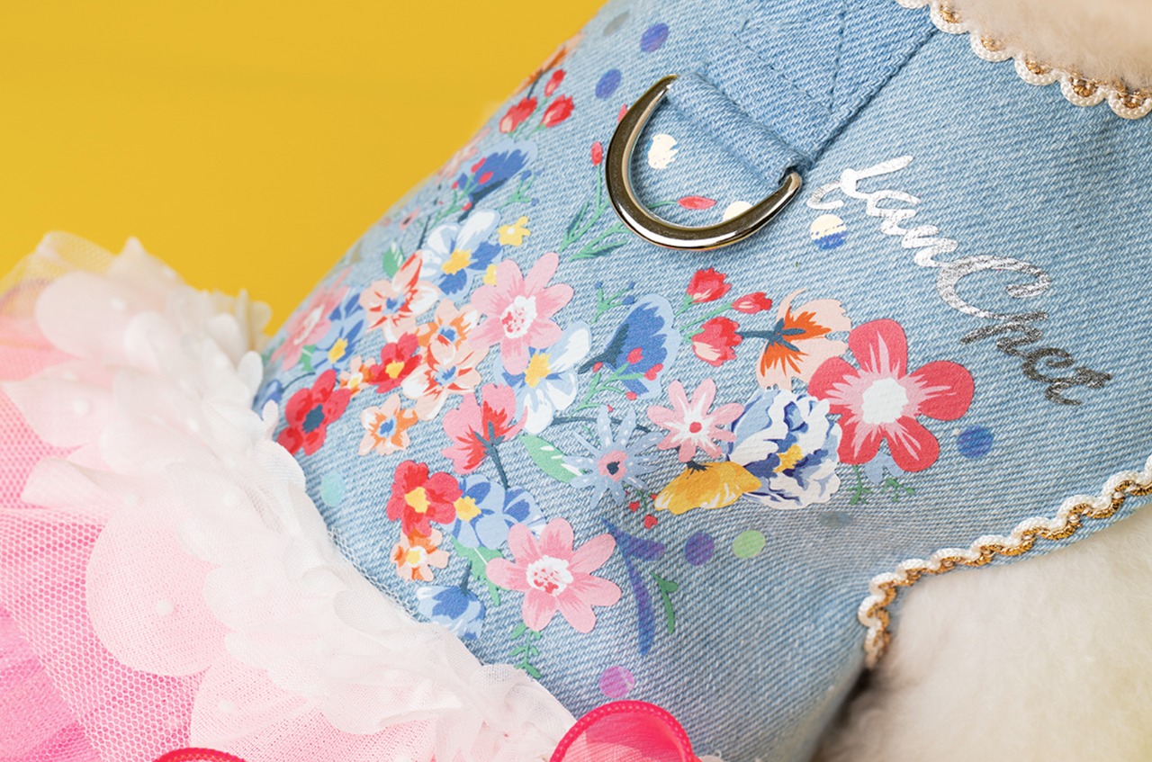 [予約販売] [fanCpet]Denim Flower Harness Dress Girlは、女の子の可愛らしさを引き立てる魅力あふれるデニムハーネスドレスです!特別な日やイベントにぴったりなデザインで、愛犬をおしゃれに演出します。耐久性に優れたデニム素材は、柔らかく快適な着心地を実現。色鮮やかなフラワー模様がアクセントとなり、さまざまなシーンでのコーディネートにも対応可能です。愛犬との楽しいひとときをより特別なものにするためのアイテムとして、ぜひご検討ください!