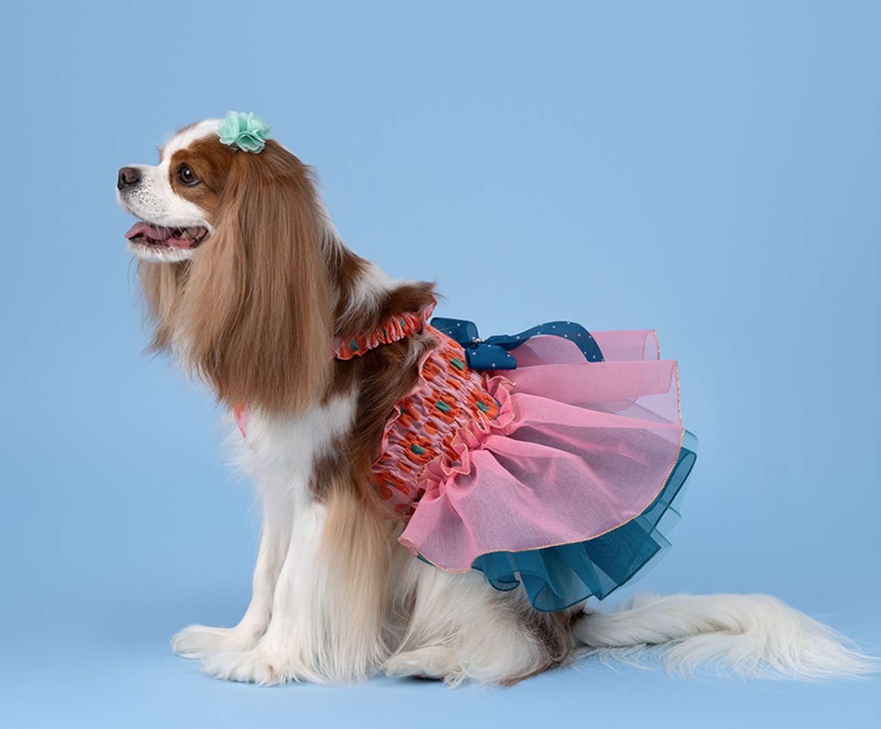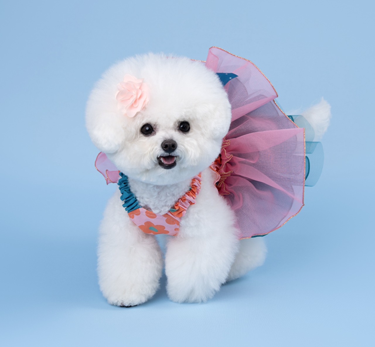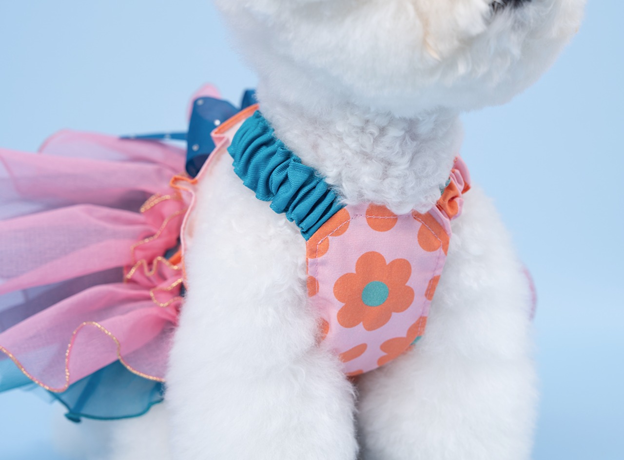 [予約販売] [fanCpet]Flower Bom Bom Dress-Pink/Blueは、愛犬愛猫の愛らしさを引き立てる華やかなデザインが特徴のドレスです!特別な日やイベントにぴったりで、愛犬愛猫をスタイリッシュに演出します。鮮やかなピンクとブルーの配色で、見ているだけで心が弾むような印象を与えます。軽やかな素材を使用しており、快適な着心地も実現。他の犬服では味わえない特別感のある一着をぜひお楽しみください!